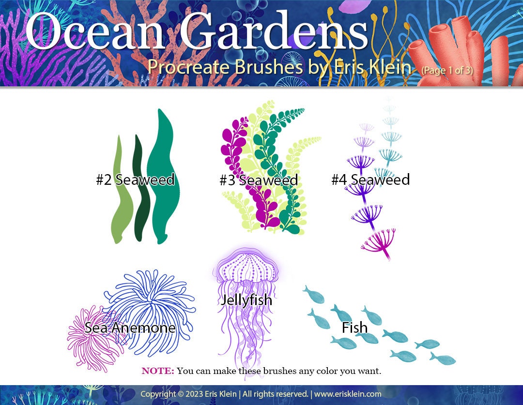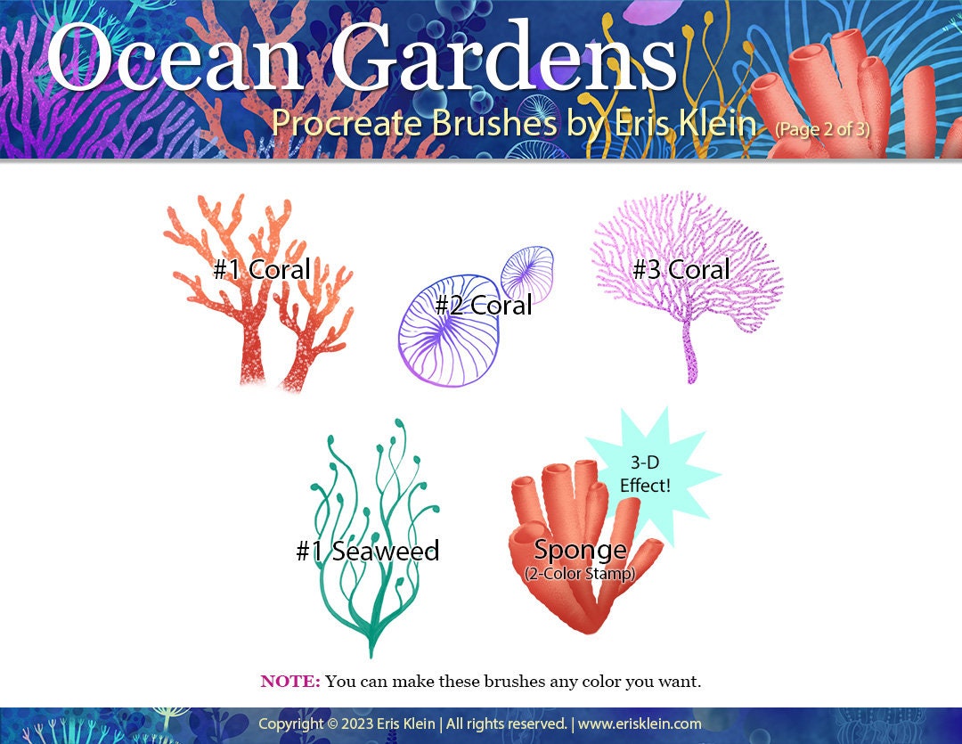 ---> 14 Single-Color Stamps/Brushes (corals, seaweed, fish, & watercolor backgrounds)