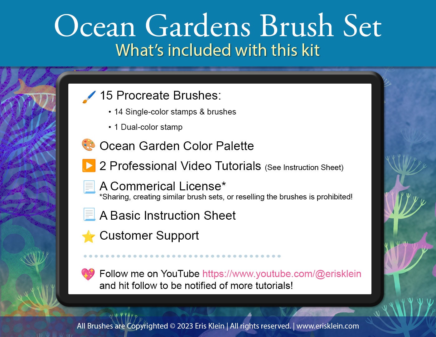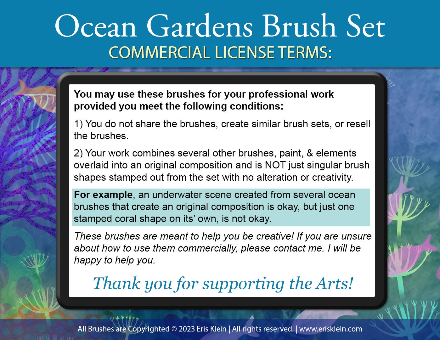 These brushes are meant to help you be creative! You may use these brushes for your professional work provided you meet the following conditions: 1) Your work combines several other brushes, paint, & elements overlaid into an original composition and is NOT just singular brush shapes stamped out from the set with no alteration or creativity. 2) You do not share the brushes, create similar brush sets, or resell the brushes. 🌺 For example, an underwater seascape created from several brushes that overlap and combine into an actual composition is okay, but just one ocean stamp on its’ own, is not okay.