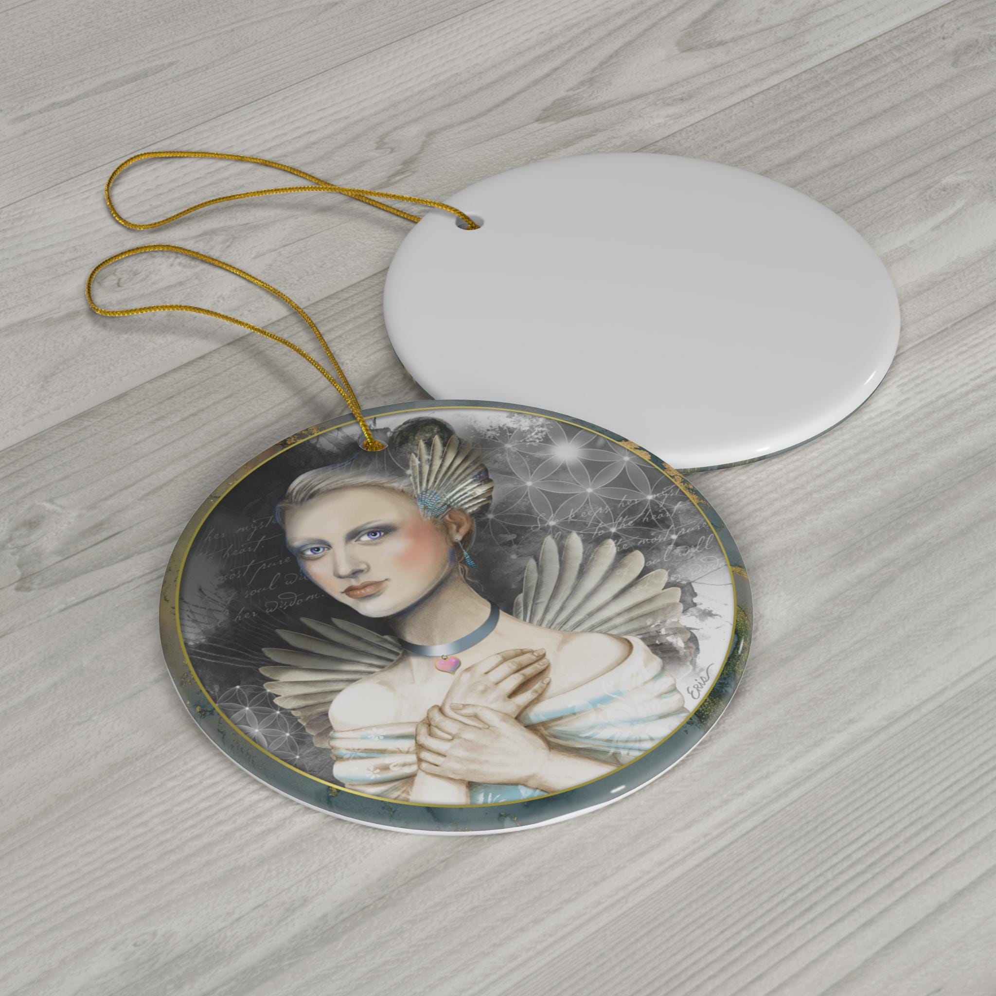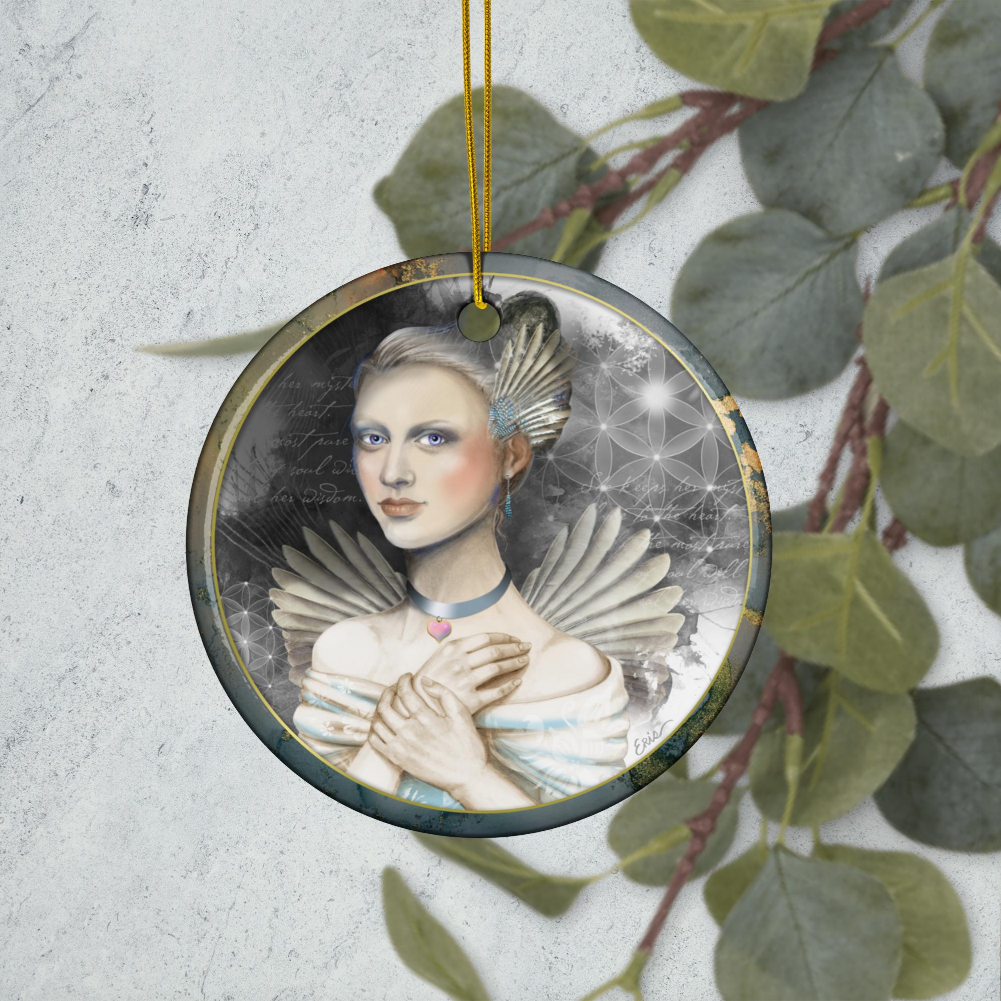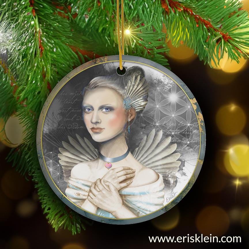 An original angel painting by Eris Klein. Use it as a seasonal decoration or hang it up for inspiration. These custom-made ceramic ornaments can be the perfect heirloom to use year after year, generation after generation.