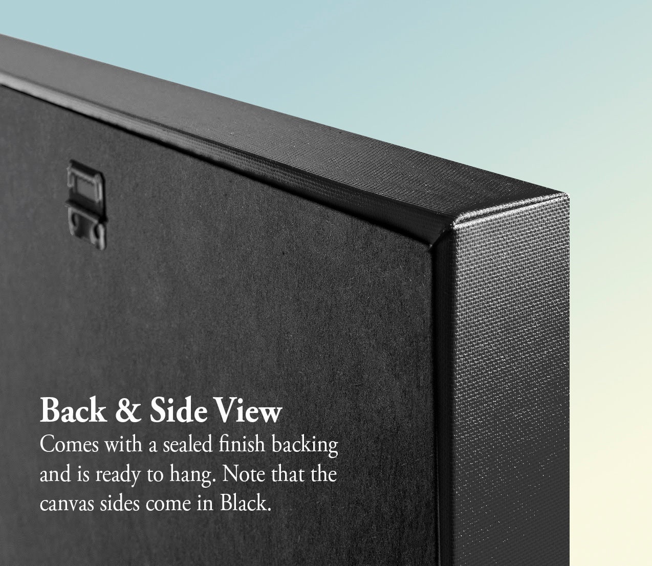 Superior archival poly-cotton blend canvas with a near-matte surface with a subtle sheen. Printed with eco-solvent inks that are both scratch and smudge-resistant and offer UV resistance for longevity. Sides are black. Back side is finished with wall bumpers and hanging hardware.