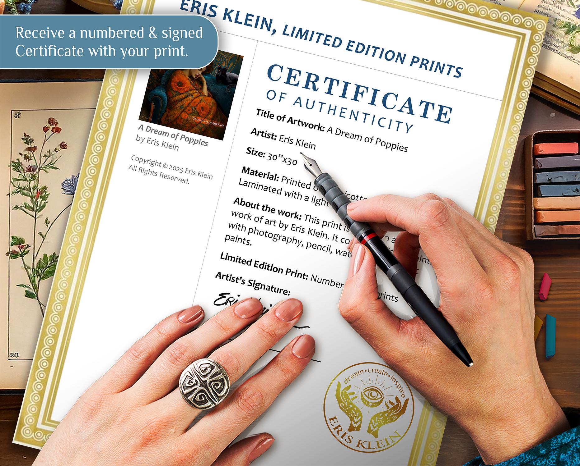 An angel walks towards an arched opening that is lit up by a beam of light from above. Based on an original painting by Eris Klein painted with thick strokes of paint and vibrant colors. Comes with a signed, numbered Certificate of Authenticity. Only 40 prints per category to be sold.