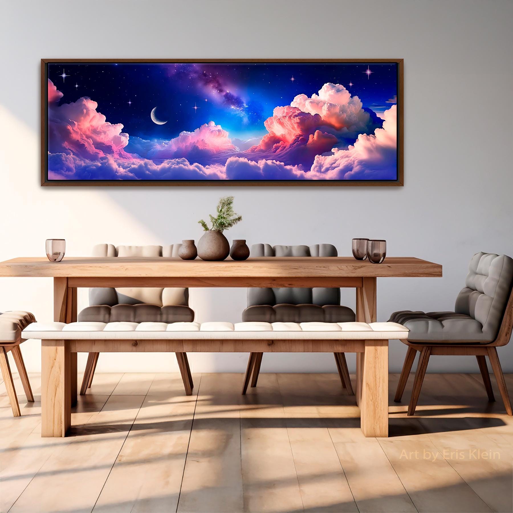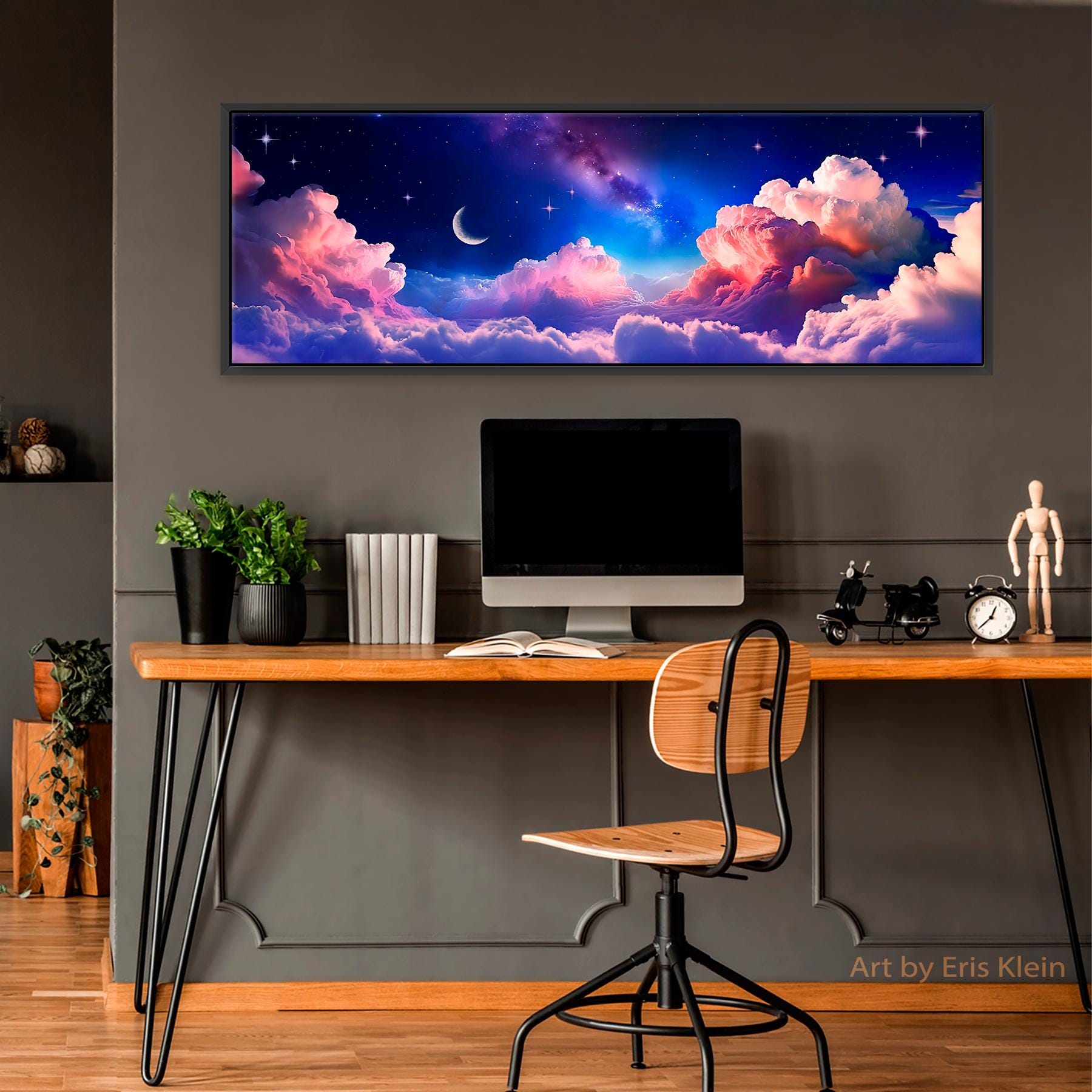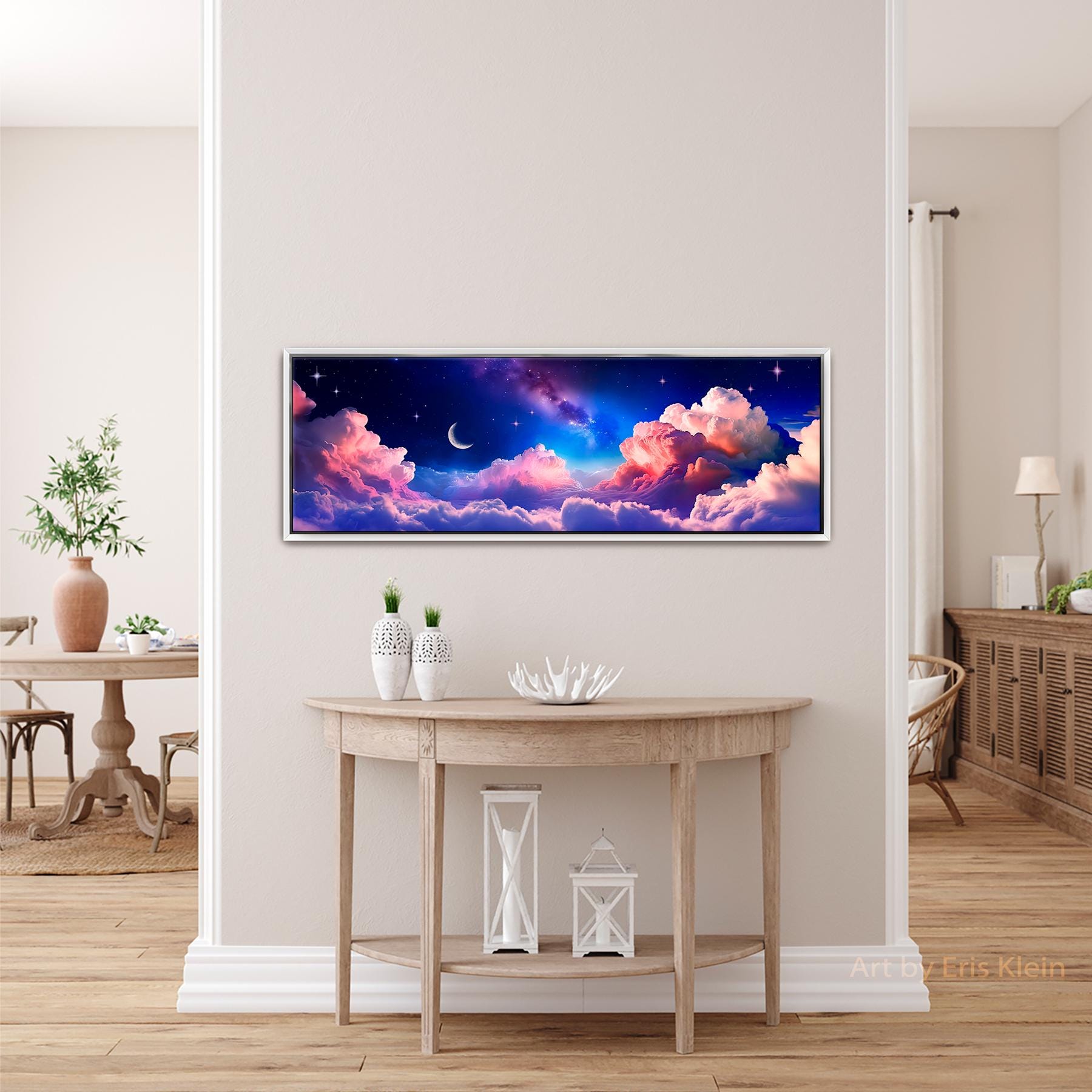 A panorama of dreamy sunset pink clouds among celestial skies. If you look close you will see the milky-way galaxy, sparkling stars and a crescent moon.