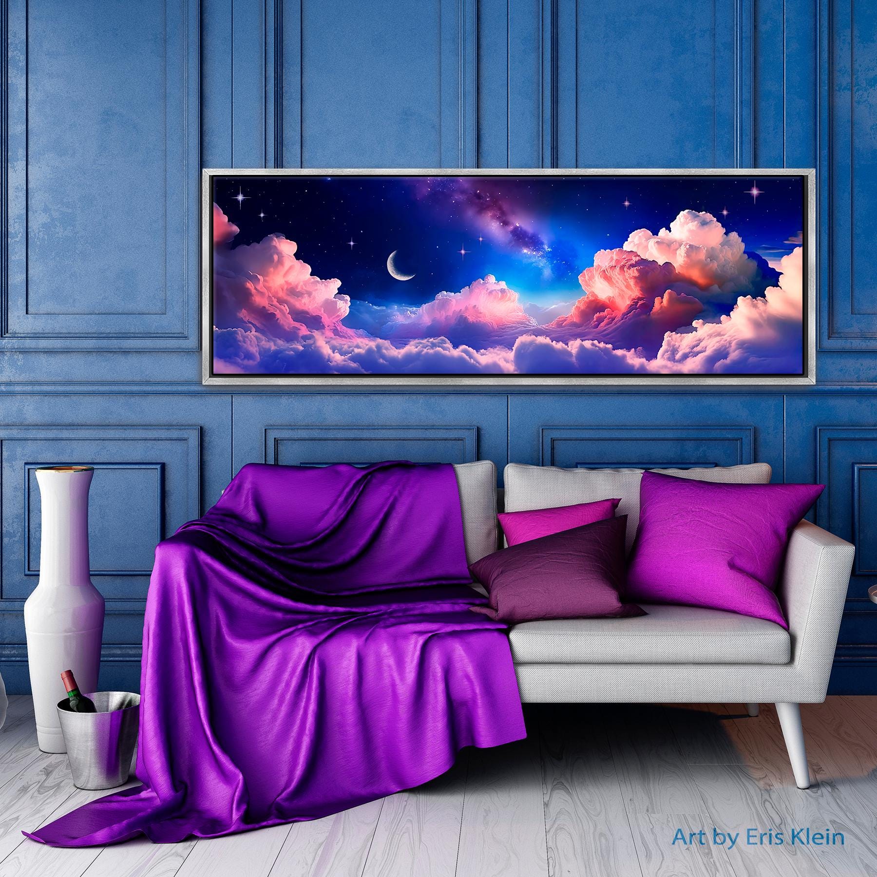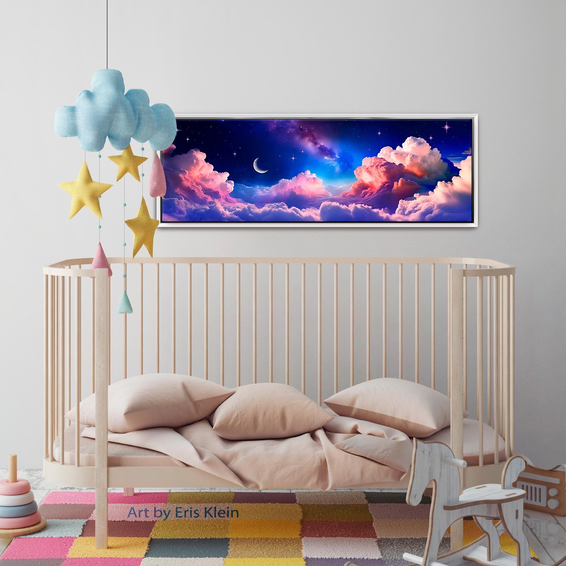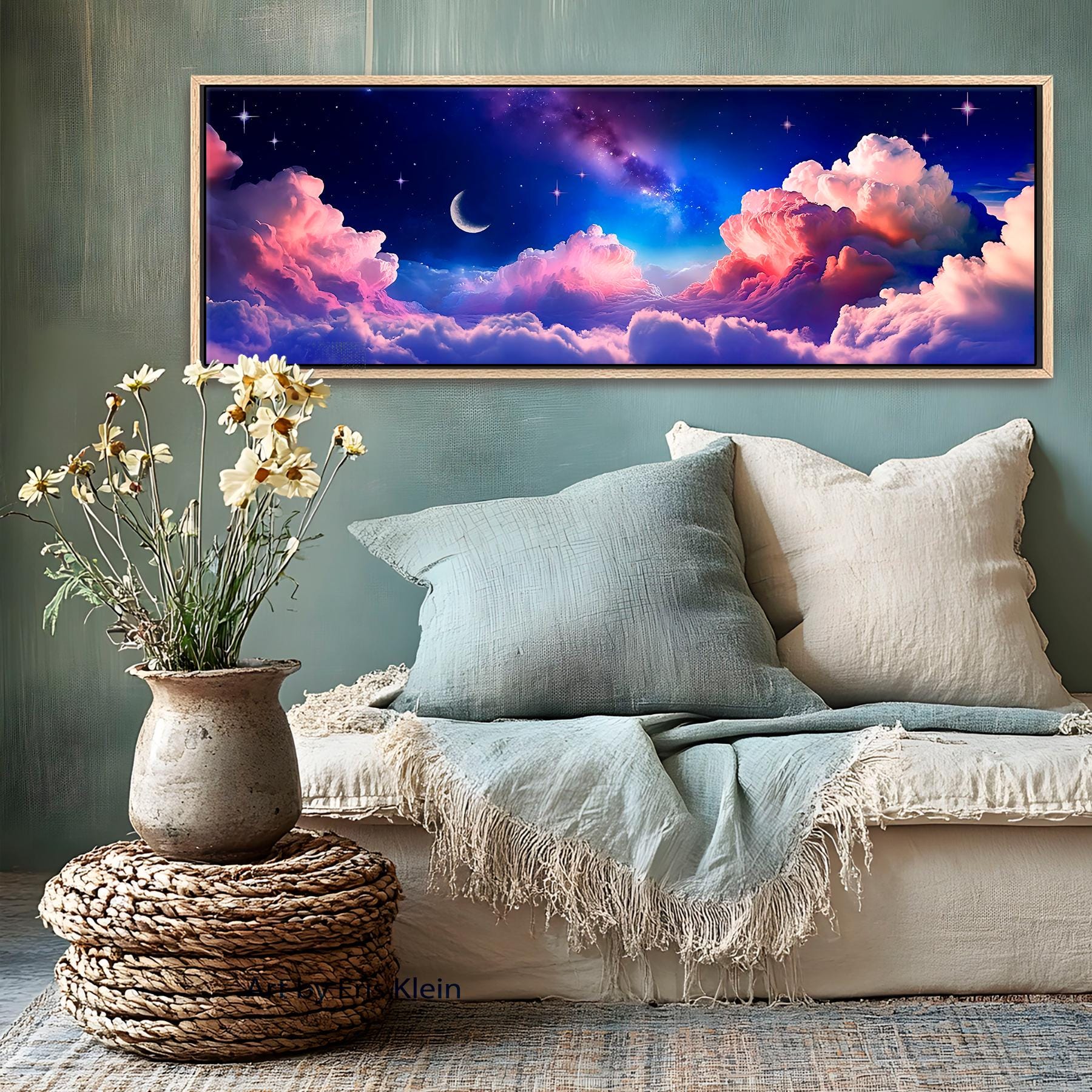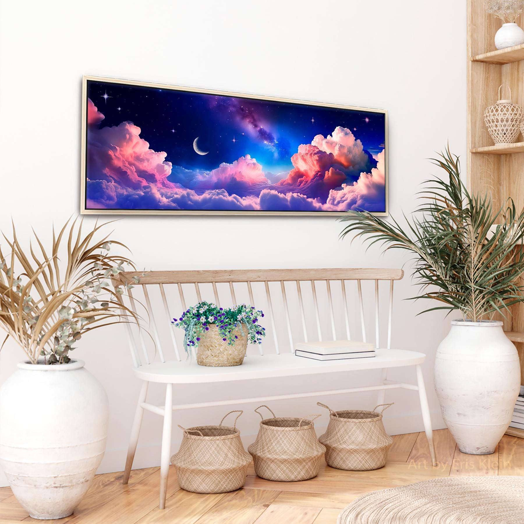 A panorama of dreamy sunset pink clouds among celestial skies. If you look close you will see the milky-way galaxy, sparkling stars and a crescent moon.